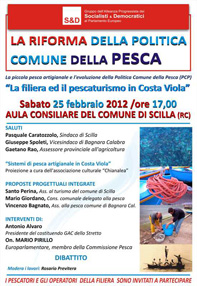 Il futuro della pesca in chiave europea è un tema particolarmente sentito a Scilla. Molto partecipato, infatti, soprattutto da un folto numero di pescatori, è stato il convegno, che si è tenuto sabato nella sala consiliare del comune, dove gli argomenti discussi sono stati: La riforma della politica comune della pesca - La filiera e il pescaturismo in Costa Viola. Ospite e relatore d'eccezione è stato l'europarlamentare Mario Pirillo del gruppo Socialisti & Democratici al Parlamento Europeo ,membro della Commissione Pesca, che ha voluto cominciare proprio dal territorio della Costa Viola reggina il suo tour in Calabria e nel sud Italia finalizzato a divulgare i nuovi orientamenti europei e le opportunità concrete per la filiera ittica, ascoltando alche le proposte provenienti da coloro che vivono quotidianamente i problemi legati al settore. Il nuovo Fondo Europeo per gli Affari Marittimi e la Pesca (FEAMP) è stato uno degli argomenti trattati durante la sessione dei lavori coordinati dall'agronomo Rosario Previtera Dopo i saluti del sindaco di Scilla Pasquale Caratozzolo, del Vicesindaco di Bagnara Giuseppe Spoleti e dell'assessore provinciale all'agricoltura Gaetano Rao, è stato proiettato il filmato Sistemi di pesca artigianale in Costa Viola a cura dell'associazione culturale Chianalea. La discussione si è incentrata su una serie di proposte progettuali integrate ad opera di Santo Perina assessore al turismo del comune di Scilla e promotore dell'iniziativa. Barriere subacquee a difesa dalla fauna marina e della poseidonia, un percorso turistico nella Costa Viola, museo della pesca ed arti marinare sono state le proposte avanzate da Perina. Considerando gli orientamenti europei, la pesca artigianale, fiore all'occhiello dell'economia locale, potrebbe sopravvivere come attrazione turistica, ad esempio<<le passerelle- propone Perina-potrebbero diventare luoghi di degustazione>>. Secondo l'assessore la pesca, soprattutto lungo le nostre coste, necessita di una vera e propria rivoluzione, che punti soprattutto sull'integrazione con il turismo e con il pescaturismo nonché sulla valorizzazione della piccola pesca artigianale. Un tipo di pesca sostenibile dal punto di vista economico ed ambientale e che possa aggregare seriamente i vari soggetti della filiera. Probabilmente la nuova riforma della Politica Comunitaria della Pesca e la sua applicazione unitamente alle azioni del futuro Gruppo di Azione Costiera - GAC potranno finalmente consentire quanto auspichiamo da tempo immemore. Dovranno però essere i pescatori i veri protagonisti del cambiamento.Crede ancora nel futuro della pesca come opportunità occupazionale per i giovani, il consigliere delegato alla pesca, Mariano Giordano, che si è fatto portavoce delle difficoltà che i pescatori vivono, in seguito alle restrizioni sancite dalla normativa europea. Giusy Nuri (Calabria Ora 27/02/12) torna sopra